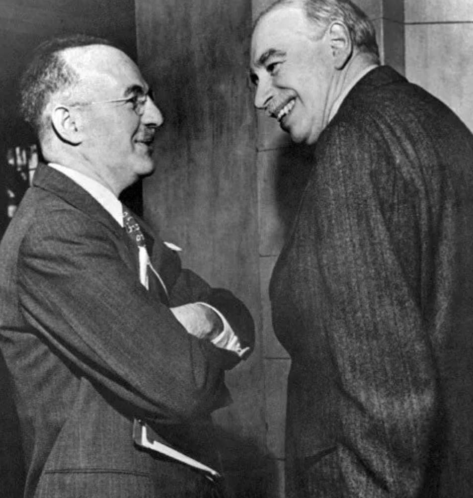 哈里·德克斯特·怀特(左)和约翰·梅纳德·凯恩斯勋爵(右)出席1944年布雷顿森林货币会议。由世界银行集团档案馆提供。
